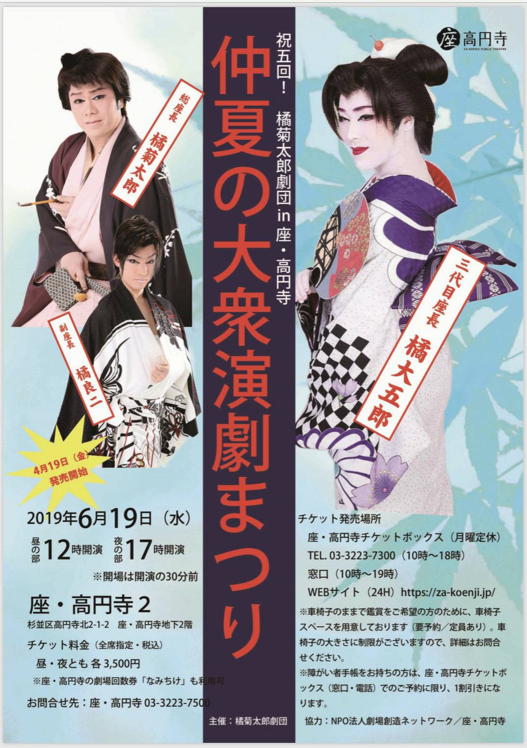 6/19 仲夏の大衆演劇まつり 高円寺 2019年04月11日 お知らせ 0 6月19日(水)仲夏の大衆演劇まつり 高円寺昼の部12:00開演夜の部17:00開演料金昼夜とも各3,500円劇団先行受付4月15日よりショートメールにて劇団携帯090ー8001ー4175迄 [0回]PR