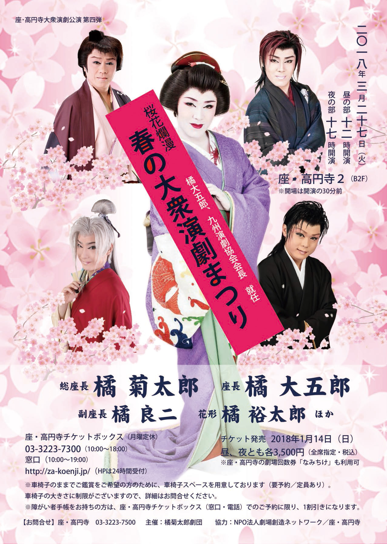 3/27 春の大衆演劇まつり 座・高円寺 2018年01月11日 お知らせ 0 3/27 春の大衆演劇まつり 座・高円寺 毎年恒例になってます、高円寺公演3月27日に決まりました。チケットの予約は劇団携帯へ、ショートメールにて、お願いします。劇団携帯090 8001 4175 [2回]PR