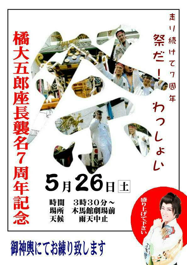 5/26(土)お神輿にてお練り致します 2018年05月15日 お知らせ 0 5/26(土)橘大五郎 座長襲名7周年記念お神輿にてお練り致します。時間:15時30分~場所:木馬館劇場前雨天中止です。 [0回]PR