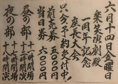 6/14 楽笑演劇殿一周年記念座長大会 2019年05月22日 お知らせ 0 6月14日(金)楽笑演劇殿一周年記念座長大会出演者橘 菊太郎総座長錦 はやと座長小林 真総座長藤 仙太郎座長みやま 昇太座長早乙女 紫虎座長澤村 雄馬座長滝 夢之助座長一條 みのる副座長宝海大空座長下座ー宝海劇団前売りー五千円当日券ー六千円昼ー12時開演夜ー18時開演チケット、申し込みは劇団携帯へショートメールにてお願いします。090ー8001ー4175迄 [1回]PR