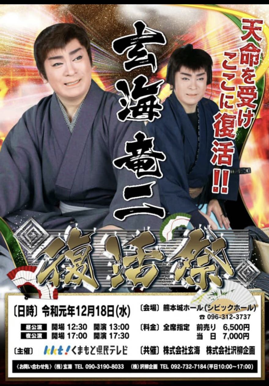 12/18「 玄海竜二 復活祭」三代目、出演決定 2019年10月08日 お知らせ 0 「玄海竜二一座」 復活祭に 三代目座長 橘大五郎、出演致します。 ■開催日時 2019年12月18日(水) 昼の部 13:00~ 夜の部 17:30~ ■場所 熊本城ホール(シビックホール) 熊本県熊本市中央区桜町3 ■料金 前売 6500円 当日 7000円 <主催>くまもと県民テレビ <共催>株式会社玄海 株式会社沢柳企画 ■お問い合せ 株式会社玄海 TEL 090-3190-8033 株式会社沢柳企画(平日10時~17時) TEL 092-732-7184 [2回]PR