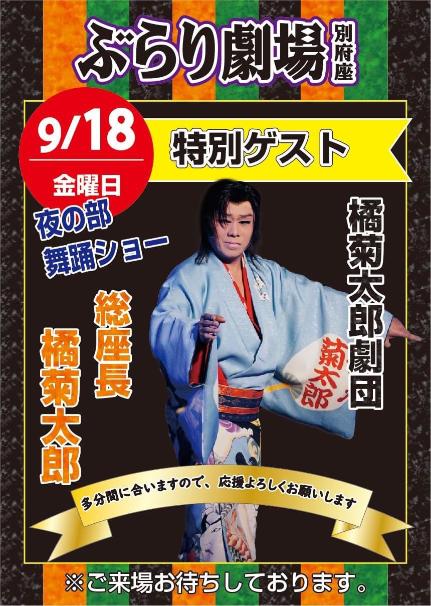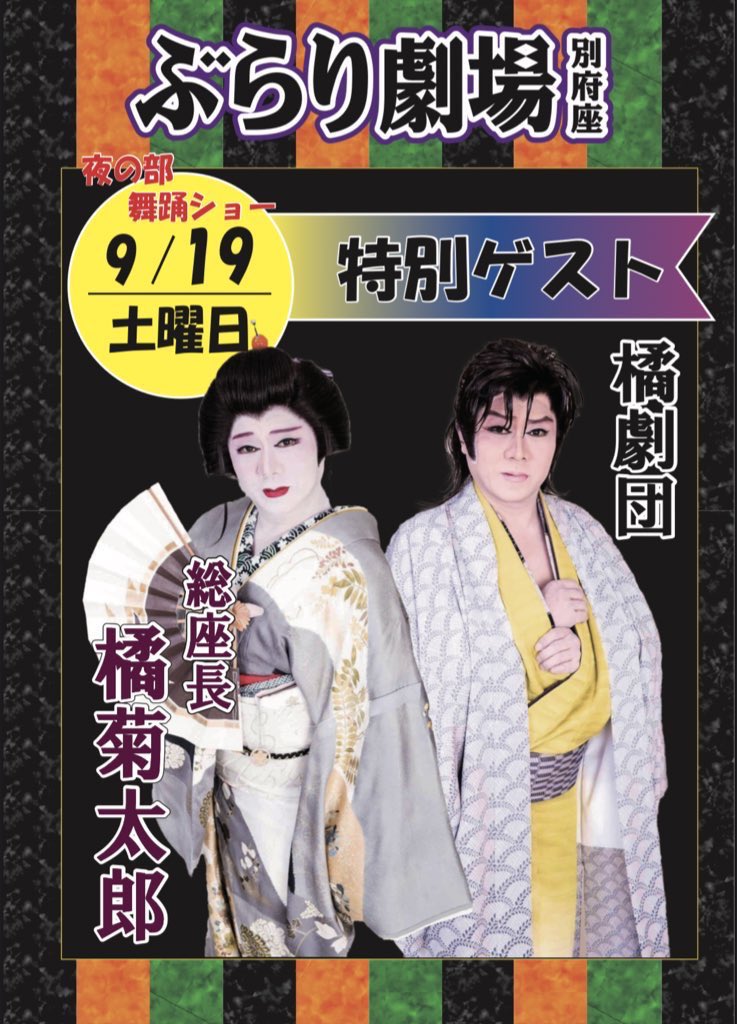 9/18(金)夜の部舞踊ショー『橘菊太郎劇団』総座長 橘菊太郎ゲスト出演決定しました!!夜の部の舞踊ショーに間に合うように別府座にきてくれます!!19日(土)夜の部舞踊ショーと合わせて2日間、ご来場お待ちしております✨#橘劇団 #藤間劇団 #ぶらり劇場別府座 pic.twitter.com/48E0gx4yJr