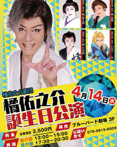 4/14 総座長、小次郎ブルーバード劇場にゲスト出演 2021年03月27日 ゲスト出演 0 4月14日 (水)総座長 橘菊太郎橘小次郎ブルーバード劇場橘佑之介座長「誕生日公演」にゲスト出演 [0回]PR